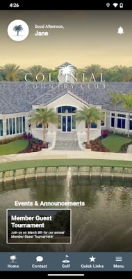 Welcome to the Colonial CC app, where the experience of our members is our primary focus. We have developed a custom app to enhance your experience on and off property. With only a couple of taps, you can present a digital membership card for staff. You also have easy access to detailed information about the club as well as to beautiful photos from our events and facilities. There are even several ways to communicate with us, including signing up for club events, ordering food and beverages to-go, or requesting a spa treatment. We hope you enjoy the digital Colonial CC experience.